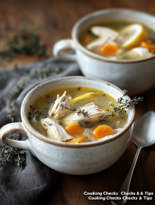 This chicken soup features tender shredded chicken simmered with aromatic vegetables, fresh thyme, and bright lemon, creating a comforting yet lively broth. The soup has a clear, flavorful appearance with vibrant hints from the lemon and herbs, finished with a warm, inviting texture. It’s a simple, adaptable dish perfect for quick weeknight dinners or soothing weekends.