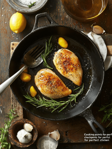 - Squeeze lemon juice over the chicken and reduce the heat to medium. Cover the skillet with a lid or foil and cook for an additional 5-6 minutes, checking that the internal temperature reaches 75°C (165°F) with a meat thermometer.