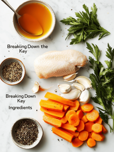 • Whole chicken: The backbone of flavor. A slow simmer extracts rich, gelatinous goodness.